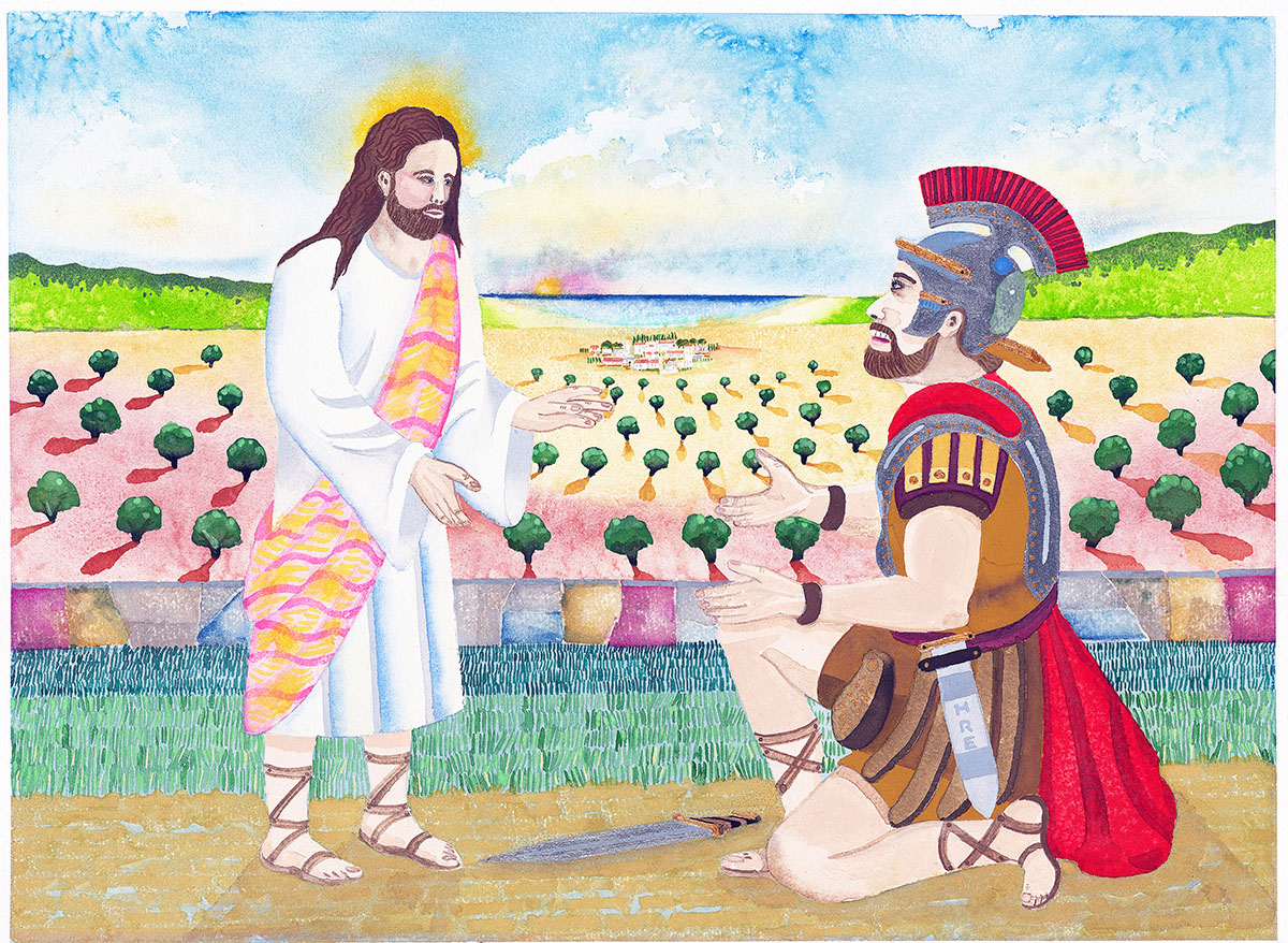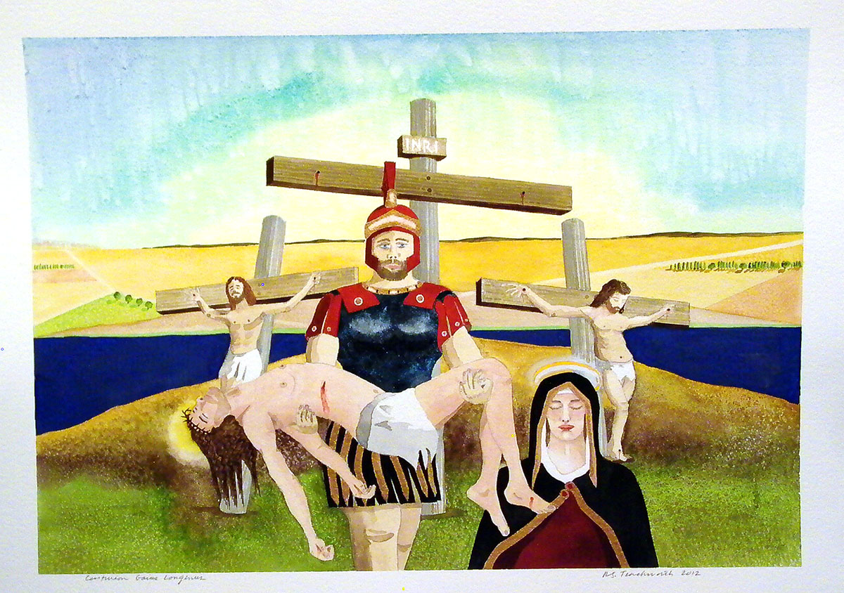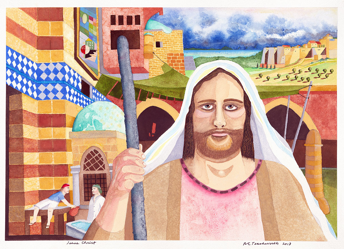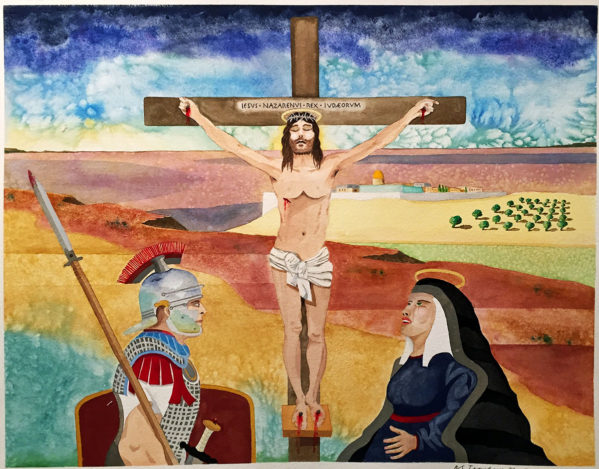 This event was extremely encouraging, and I began to study and research the paintings of Jesus, dating back to the fourteenth century. I spent time studying the work of Giotto, Raphael, de Vinci, Caravaggio, Botticelli, Rubens, Velazquez, Durer, Mantegna, Fra Angelico, and, Giovanni Bellini. I started by using many of the same traditional depictions in art history but developed my own interpretations relating to the figures, composition, color variations, and settings. Technically, I borrowed much from my previous work in watercolor, like adding backgrounds, texture to surface areas and my approach to a balanced composition.
