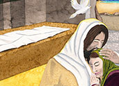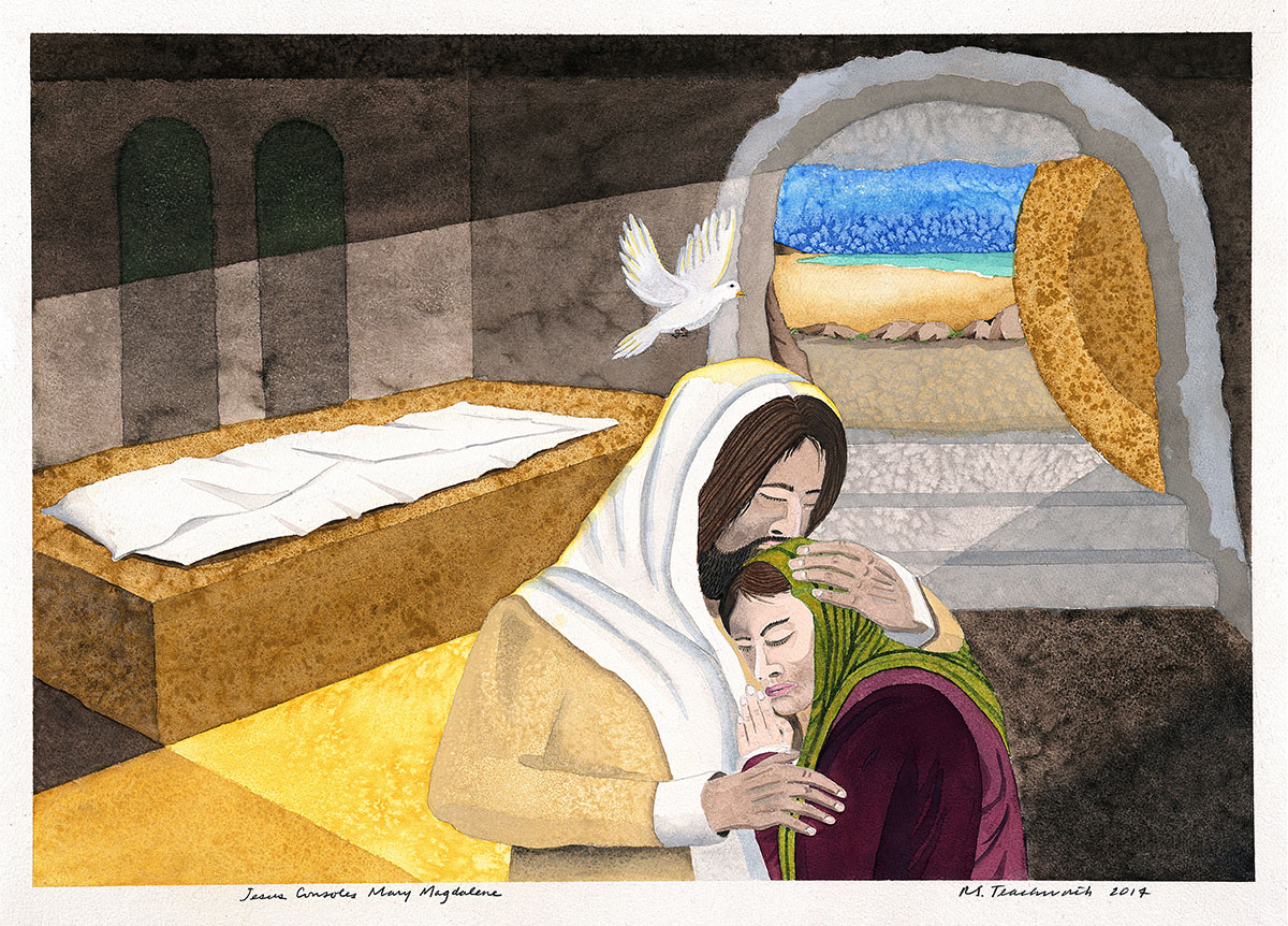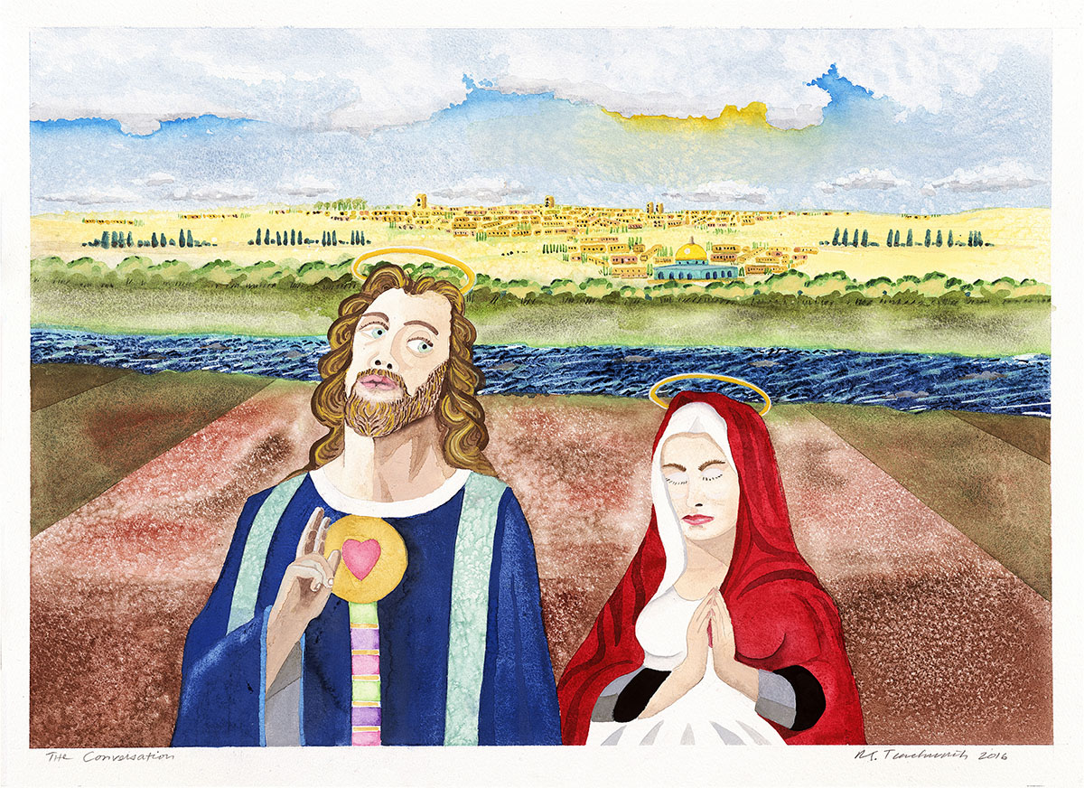 All of these works are new interpretations from many episodes in the Bible. Two are entirely newly conceived ideas like Mary Visits Jesus, and The Conversation. In the beginning, I was selecting passages that I was drawn to, both from the Bible, and from the visual art record that had been created in the past. I did not realize that as I painted, I was creating a visual narrative in the events of the life of Jesus Christ: From The Annunciation to Ascension in sixteen works of art.